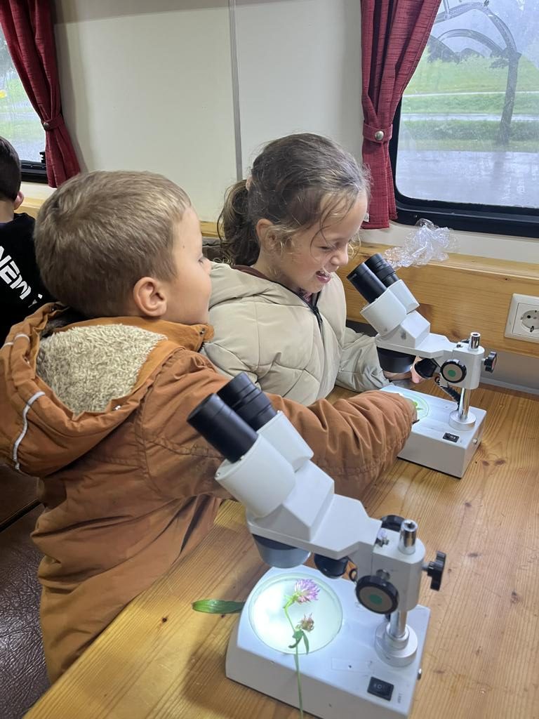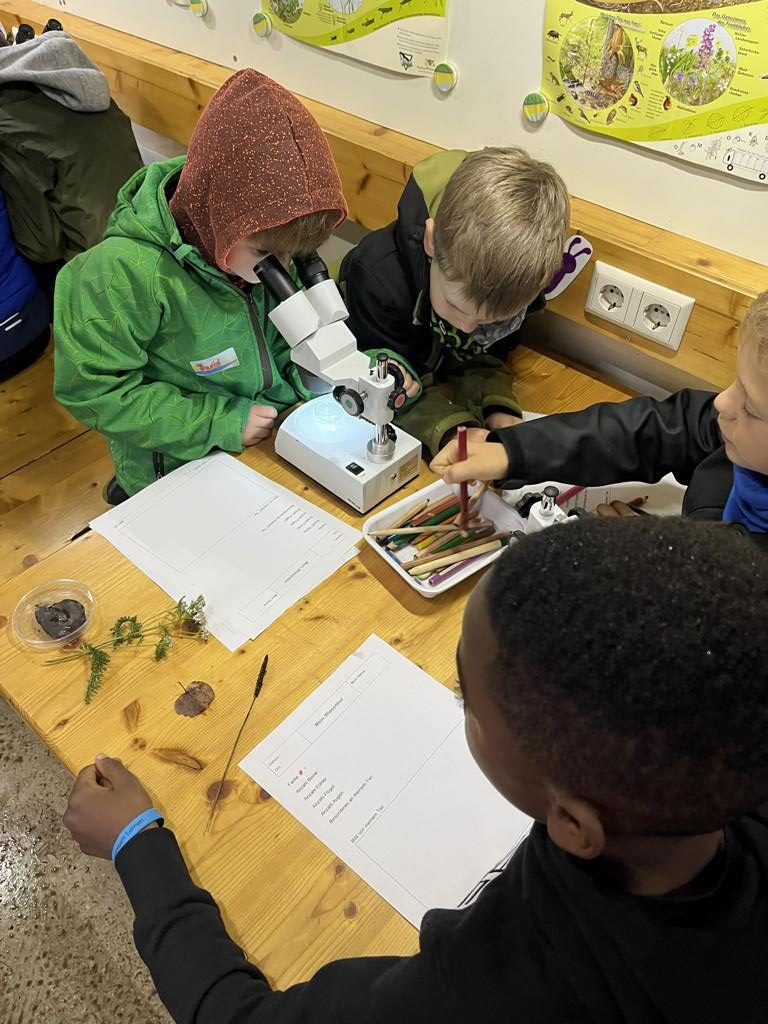 Die Klasse 2a widmete sich an diesem Vormittag dem Lebensraum verschiedener Pflanzen und Tiere auf den Dietinger Wiesen. Nachdem die kleinen Forscher ihre Errungenschaften in Teamarbeit eingefangen hatten, wurden diese mit Hilfe von Mikroskopen eingehend beobachtet. Dabei waren die Kinder völlig fasziniert, wie Tiere und Pflanzen unter vielfacher Vergrößerung wirklich aussehen. Die Leiterin des Ökomobils, Marina, lieferte dabei immer kindgerechte, wissenswerte Informationen zum Lebensraum der Wiese. Die Kinder waren sichtlich stolz, einen Tag lang in die Welt der Forscher und Forscherinnen abzutauchen.